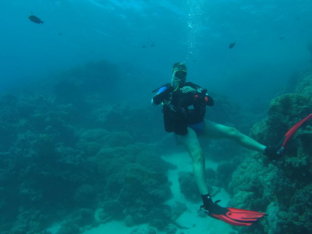 Am Nachmittag, wir haben echt lange auf den zweiten Tauchgang gewartet, geht es nun im Uhrzeigersinn um das Korallenriff herum. Wir starten in rund 17m Tiefe aber ich komme mit Atmung und Tarierung irgendwie nicht so gut zurecht. Nach einer halben Stunden deutet der Guide an, er dreht um. Wir setzen den Tauchgang noch ein paar Minuten fort und folgen den anderen langsam in geringer Tiefe. Hier gibt es aber auch richtig was zu sehen und nachdem wir in nur noch 5-6m Tiefe unterwegs sind, klappen auch Atmung und Tarierung bestens. Tanzende Rotfeuerfische und ein kapitaler Krokodilfisch erwarten uns.