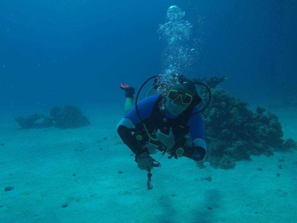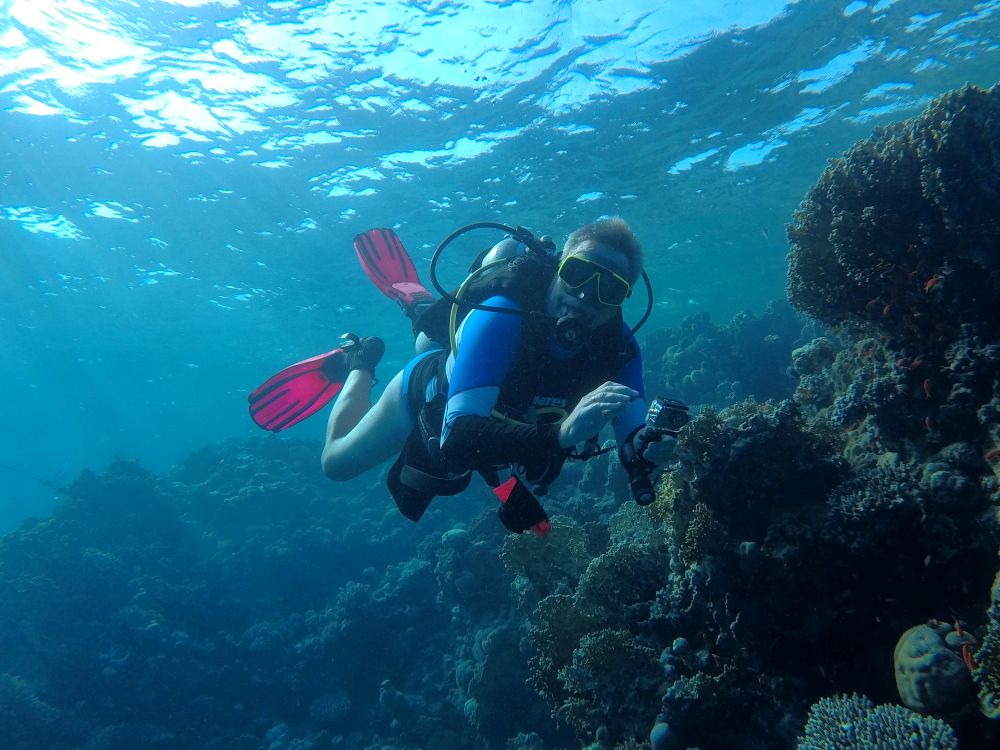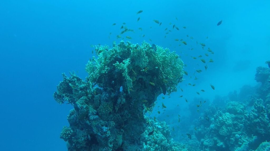 Zeitumstellung auf Winterzeit hier in Ägypten. Trotz einer Stunde mehr Schlaf ist das Treffen um 8:00 Treffen an der Tauchbasis eine echte Herausforderung. Mit dem Boot fahren wir ca. eine halbe Stunde nach Norden und da wir eine ganze Menge Leute sind, vereinbart Stephan mit den Guides eine Sonderaktion: rein ins Schlauchboot (Zodiak) und ein paar hundert Meter die Riffkante entlang. Die fluffige Nussschale tanzt auf den hohen Wellen und mein Magen tanzt mit. Schließlich zählt der SeaMen von 3 runter und wir lassen uns gleichzeitig rückwärts ins Meer fallen und tauchen sofort auf etwa 20m runter. Hier ist es ruhig und wir schweben langsam eine Stunde lang mit der Riffkante an der rechten Schulter bis zum Boot zurück.