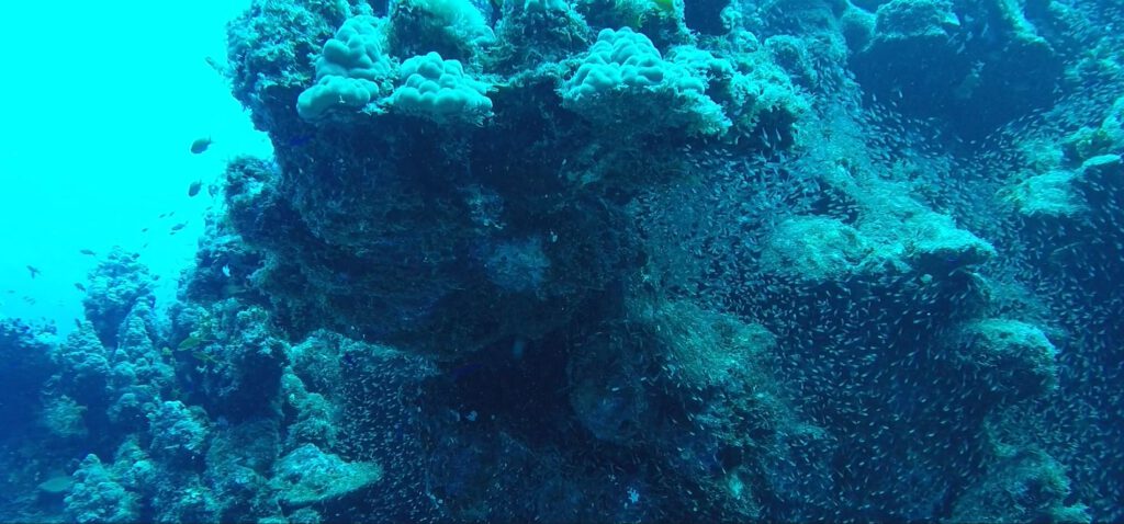 Wir machen eine gut einstündige Pause bevor der für uns zuständige DiveMaster das Zeichen gibt: „fertig machen zum nächsten Tauchgang!“. Diesmal springen wir direkt vom Boot und schleichen in bis zu 15m Tiefe nach Norden an der Riffkante entlang. Spektakuläres begegnet uns nicht, es sind aber trotzdem die zahlreichen kleinen Dinge wie Gorgonien, Poren-, Pilz- oder Straußenkorallen, die auf jedem Meter zu sehen und zu bewundern sind. Nach 30 Minuten treten wir mit 120 bar den Rückweg an, verringern die Tiefe und beobachten das Treiben der bunten Fische über uns.