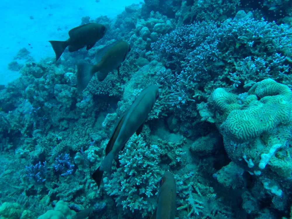 Wir lassen uns alle gleichzeitig ins Wasser fallen und das Durcheinander ist in den ersten Sekunden groß. Stephan und ich sind uns einig, dass wir den Exit aus dem Boot etwas anders organisiert hätten, aber das ist jetzt auch egal: der Kopf ist unter Wasser, das Riff an der rechten Schulter und die Strömung nur ganz leicht.