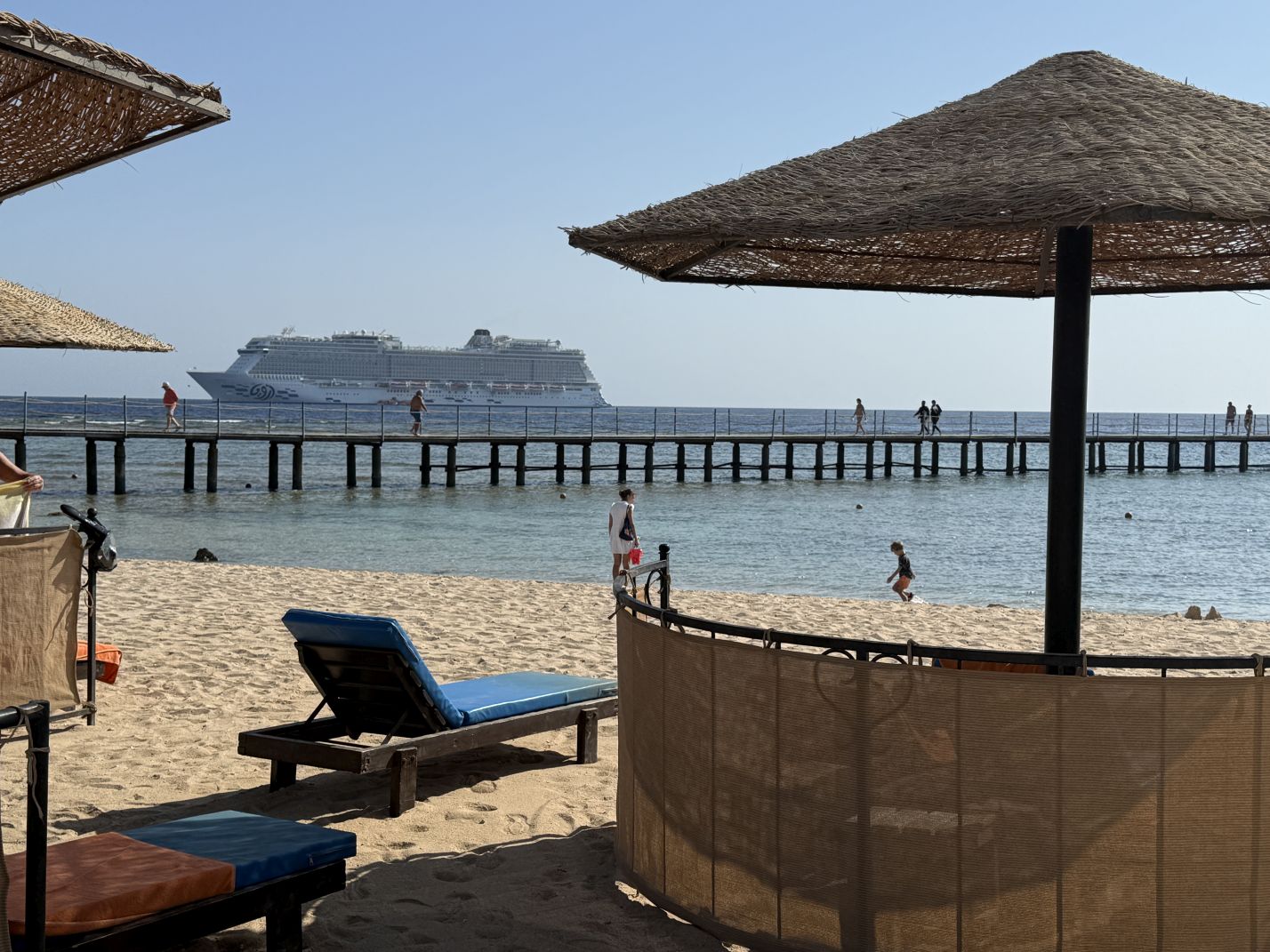 Vor der Bucht liegt die Aroya, ein Kreuzfahrtschiff der Saudies mit 5.000 Gästen an Bord von dem Zubringerboote den ganzen Tag Gäste hin und her fahren.