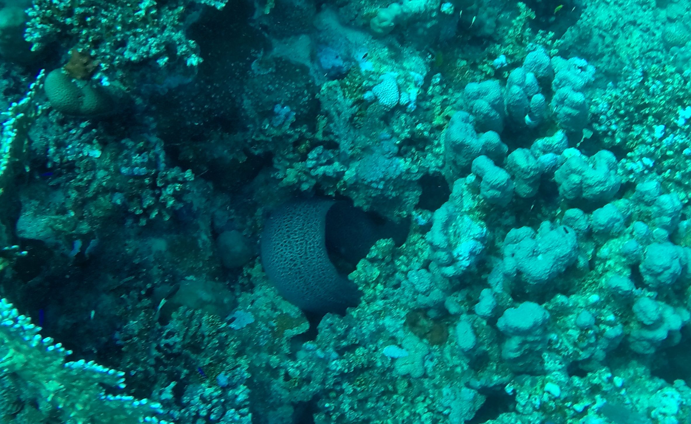 In die Nähe des Bootes zurückgekehrt zeigt uns einer der Guides, dass hinter dem nächsten Riffkamm irgendetwas zu sehen sei. Wir schweben noch ein Stückchen unterhalb der bleistiftdünnen Flötenfische weiter und sehen einen kleinen Barrakuda, der um seinen Korallenturm eine Runde dreht. Als ich weiter nach unten schaue traue ich meinen Augen nicht: zwischen zwei großen Tellerkorallen schaut in etwa 10m Tiefe eine kapitale Muräne heraus. Ihr Kopf ist dicker als mein Oberschenkel und sie windet sich in der leichten Strömung ganz langsam hin und her.