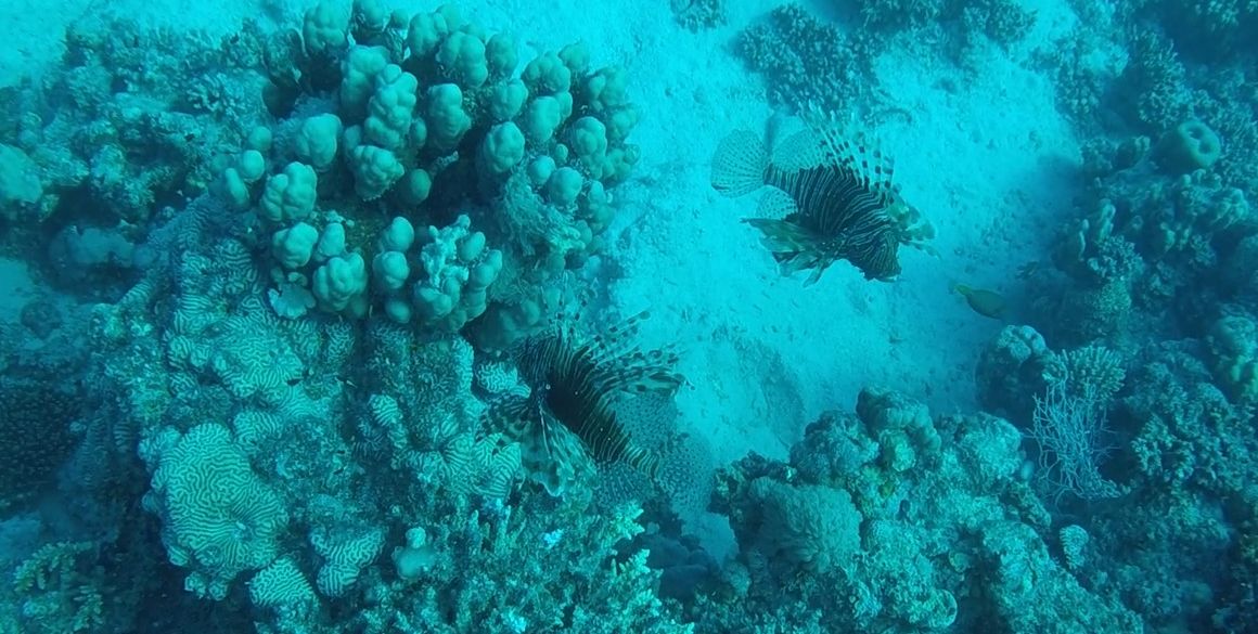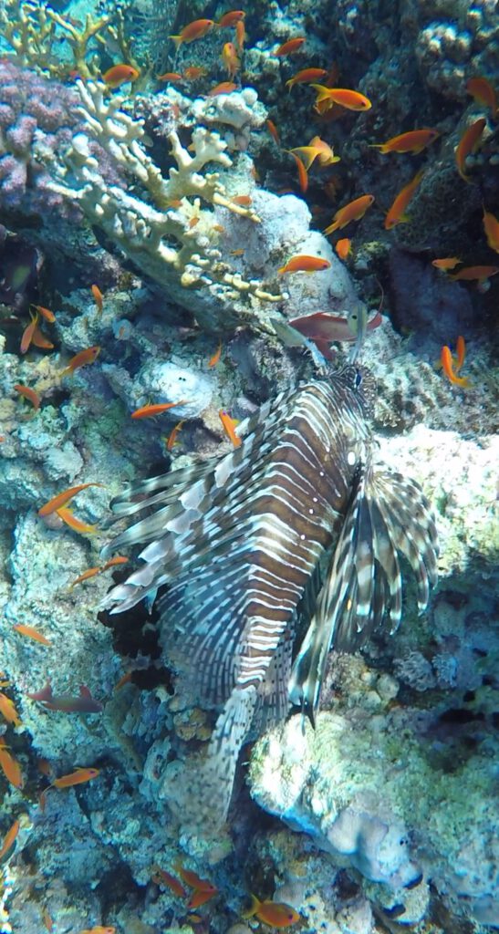 Blaupunktrochen und Riesenfalterfische dösen unter der FächerkoralleIn 17,7m Tiefe bei 28°C schwebt es sich auch für uns vortrefflichMit der wollen wir uns nicht anlegen: eine Moräne ruht sich zwischen den Korallen aus.Ein kleines Korallentor…Auf dem Foto kommt es gar nicht so gut raus: in geringer Wassertiefe ist die Farbenpracht super.Wer ihn auf diesem Bild findet darf ihn behalten: den äußerst gut getarnten Steinfisch.Zwei Rotfeuerfische tanzen umeinander herumDieser Krokodilfisch ist ebenfalls echt gut getarntDer Rotfeuerfisch lässt mich auf wenige cm heran bevor er genervt um die nächste Koralle abhautStephan hat die Ruhe weg. Und mit wem? Mit dem Stöti natürlich…
