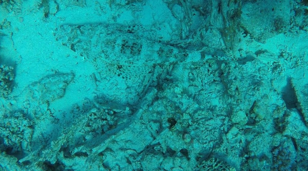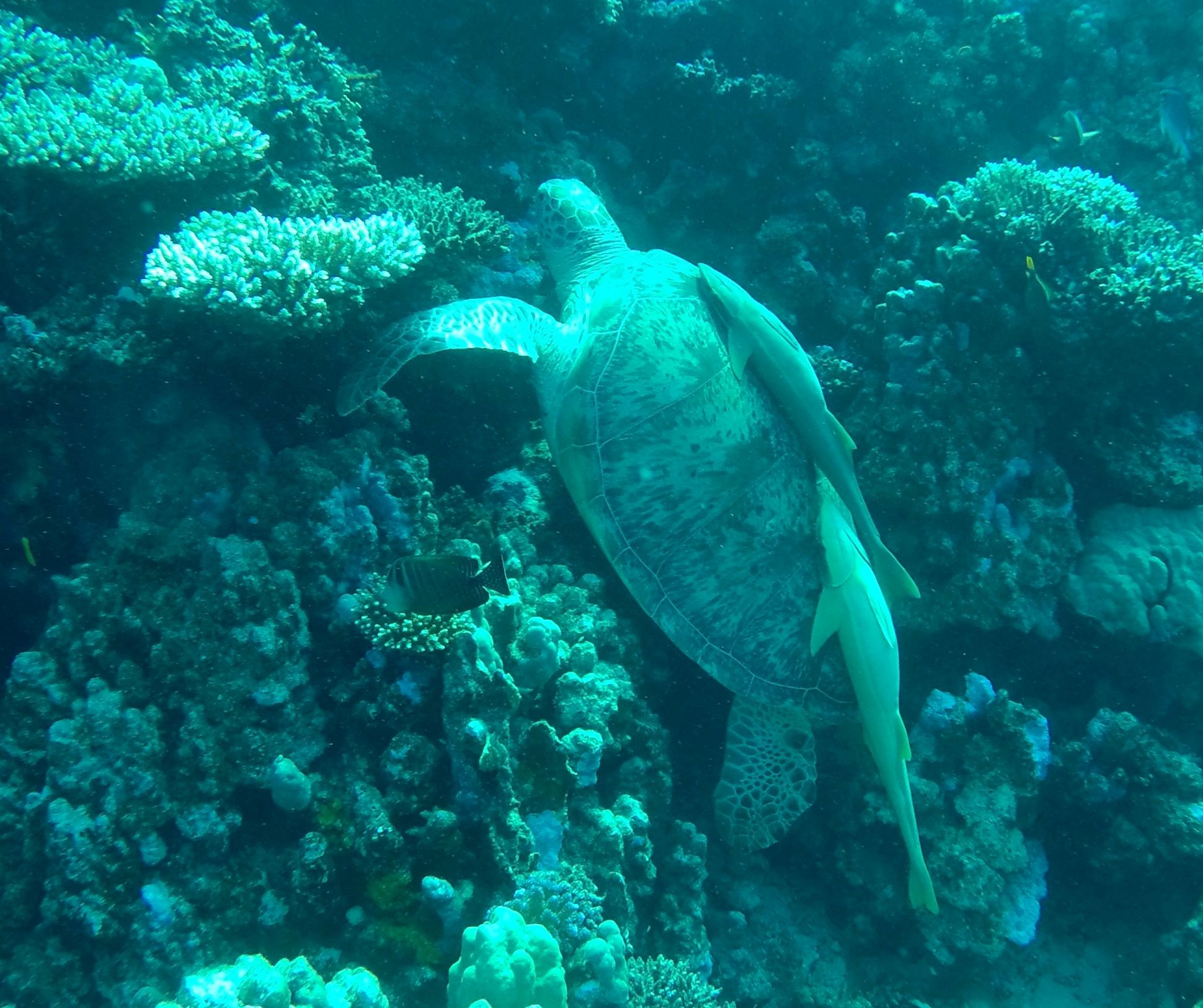 Kaum sind wir auf etwa 8m Tiefe kommt schon die erste Schildkröte an uns vorbei und nur wenige Minuten später auf etwa 12m folgt die nächste – ein etwas größeres Exemplar – und schwebt zwischen uns durch.