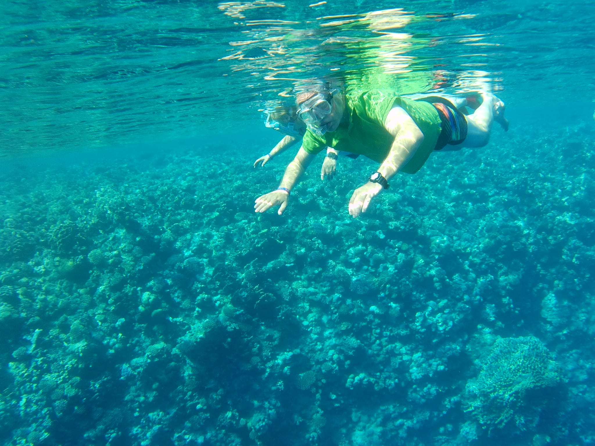 Heute ist mal wieder ein Entspannungstag geplant: Deswegen suchen wir uns nach dem Frühstück am nördlichen Steg zwei Sonnenschirme mit vier Liegen und beginnen anschließend mit einer kleinen, etwas über einstündigen Schnorcheltour bis zum rund 500m entfernten nächsten Steg. Insbesondere für Kerstin ist das ja ein ganz besonderes Abenteuer.