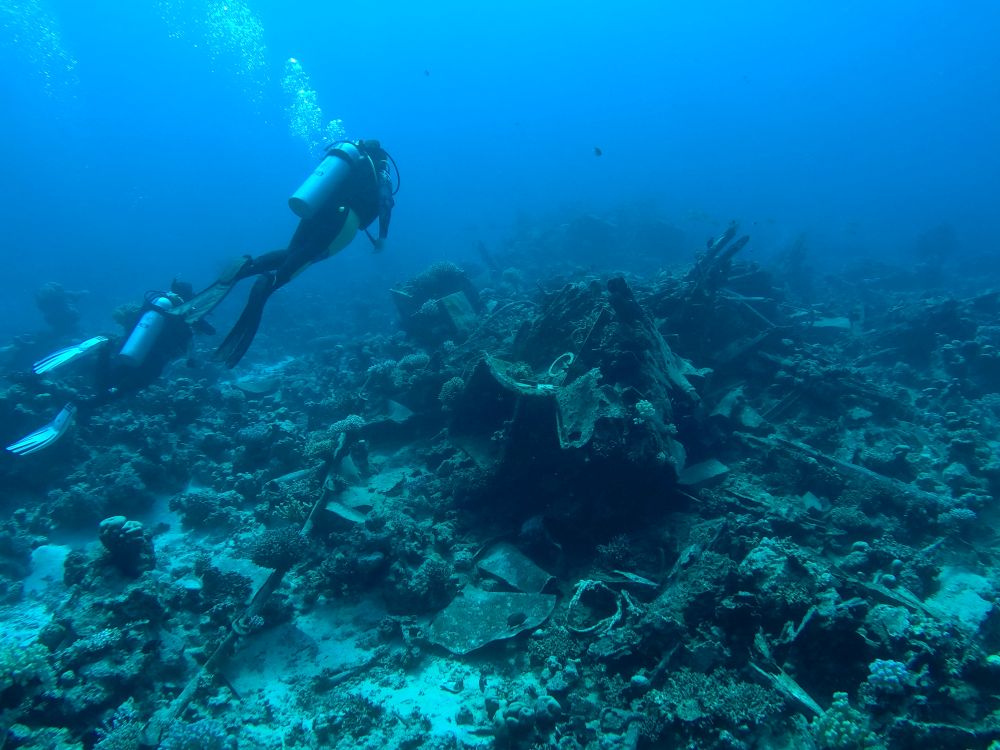 Die Tauchbasis und die DiveMaster sind bezüglich der Eignung unseres Ziels skeptisch. Während der Fahrt auf dem Boot werden wir gefragt, welche der 6 Inseln wir denn besuchen wollen. Nach kurzer Diskussion entscheiden wir uns für die Lücke zwischen Riff zwei und drei. Wir werden in verschiedene Gruppen aufgeteilt und diesmal soll es keine unguided Tour werden. Insgesamt braucht das Boot gute anderthalb Stunden bis zum DiveSpot. Wir werden in Gruppen aufgeteilt und dürfen nacheinander ins Wasser. Schon direkt nach dem Abtauchen sehen wir die Überreste eines Kutters.