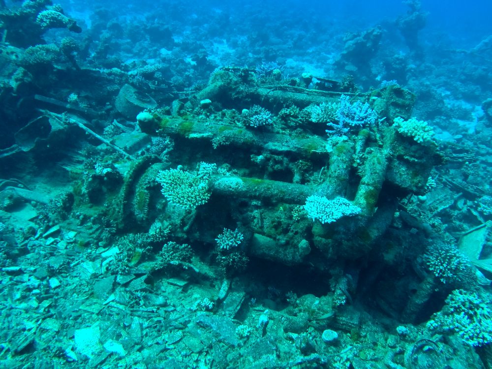 Ein wenig besser ist der zweireihige Schiffsmotor zu finden, der, nachdem das Deck auseinandergebrochen ist, jetzt frei liegt und auf dem sich die ersten Korallen ansiedeln. Ich kann mich gut daran erinnern, dass vor ein paar Jahren das Boot noch als solches gut zu erkennen war.