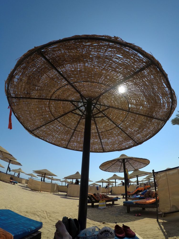 Heute ist also so ein Tag, an dem wir gemeinsam ausgiebig frühstücken und dann mit unseren SiebenSachen an den Strand flanieren, uns ein Schirmchen suchen und darunter Platz nehmen. Ich bin heute allerdings irgendwie nicht gut drauf: meine rechte Ferse tut sauweh, ich bin jasowasvonmüde und liege den Tag über still auf der Liege. Die Stillstandsbemühungen haben nur dann eine Unterbrechung, wenn wir gefragt werden, was wir trinken möchten und ich Liegen und Windschutz mal wieder mit der Sonne drehen muss.