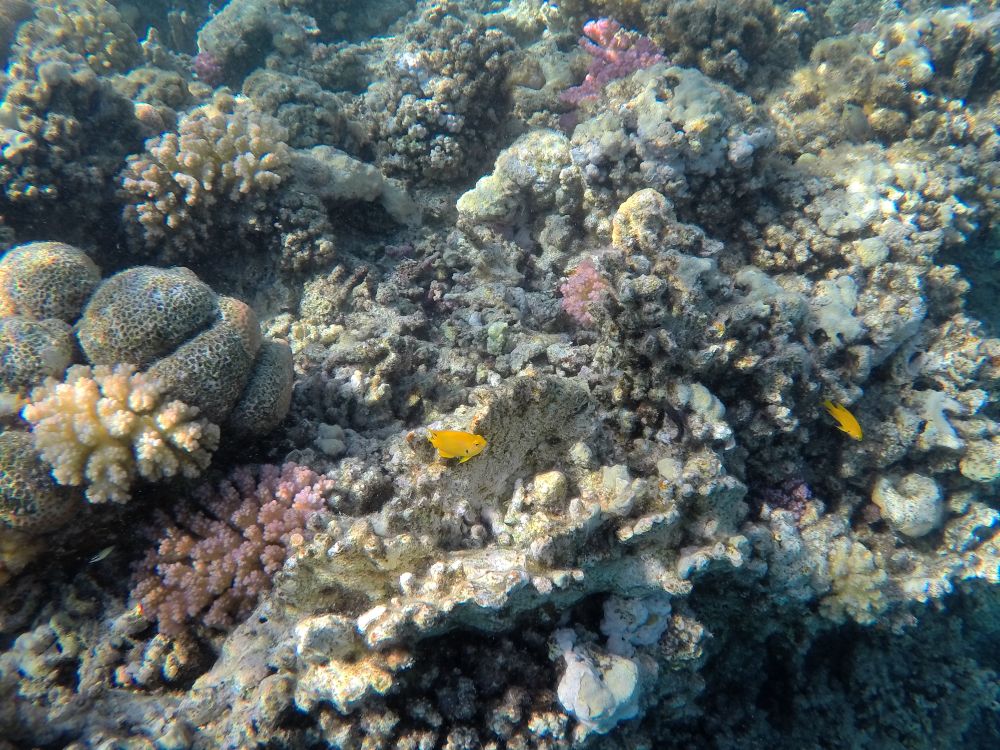 Am Strand sind die unfertigen Gebäude eines neuen Ressorts zu sehen und die offenen Häuser gähnen in die heiße Wüstenlandschaft. Vorne wühlt sich ein Bagger durch den Sand, ein Tanklaster fährt hin und her und weiter hinten reckt sich der Arm einer Betonpumpe auf eines der Dächer. Unglaublicherweise schnorchelt ein Tourist durch die Bucht. Ich kann nicht glauben, dass der in diesen Ruinen Urlaub macht. Aber davon abgesehen: hier ist das Riff eher ein Trümmerfeld, viele Algen oder Sand liegt auf den Korallentürmen und nur ziemlich weit unten fliegt eine Schildkröte vorbei.
