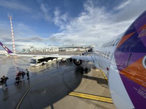 Unsere Papiere und Absichten (what are you going to do in Las Vegas?) werden bei diesem PreCheckIn von 2 Mitarbeitern kontrolliert, wir kriegen kleine Aufkleberchen auf unsere Reisepässe und dürfen weiter zum CheckIn. Auch dort stehen wir wieder reichlich lange bis wir die Bordkarten bekommen – auf die Sitzplatzwahl haben wir da keinen Einfluss mehr. Die Kofferwaage zeigt übrigens 23.0kg. Ziellandung! Weiter geht es im normalen Spaziergehschritt zur Sicherheitskontrolle. Anstehen, warten, nochmal 30 Minuten. Von dort aus zur BorderControl und die Schlange ist diesmal 150m lang. Es kommen bei mir erste Zweifel auf, ob das überhaupt zeitlich alles noch hinhauen wird. Denn wir haben schon fast zehn, das Bording beginnt um 10:15 und um 11:15 wollen wir die Nase in die Luft bringen. Es geht einigermaßen zügig – aber von den etwas über 5h am Airport haben wir fast 4.5h nur mit warten verbracht. Aber ich glaube nicht, dass wir später hätten anreisen sollen, denn die, die beim CheckIn ganz hinten standen, haben sicherlich Zeitdruck gespürt! Also ich habe das Gefühl, dass Frankfurt schon mal besser organisiert war.
