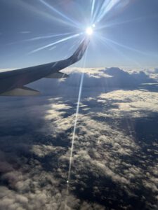 Ich marschiere rein und bin ganz schnell am CheckIn wo auch nur ganz wenige Leute warten. Also stelle ich mich ein wenig abseits um die ganzen Papiere (Covid-Erklärung, ESTA-Einreisegenehmigung, Buchungsunterlagen, Reisepass usw.) handgerecht rauszusortieren und um mich dann in die kurze Schlange zu stellen. 3 Typen mit schwerem Gepäck und Motorradjacken sind mir zuvor gekommen: „Ne“, sagt der eine im hochdeutschen Akzent, „das Gate macht erst um 8:00 Uhr auf der anderen Seite auf“. Wir quasseln ein wenig und stellen uns dann bei Starbucks an einen Tresen und trinken noch etwas. Die drei kommen aus dem Bremer Raum und sind etwas irritiert, dass die Info über die Tour auch so weit südlich angekommen ist.